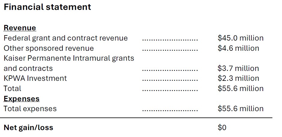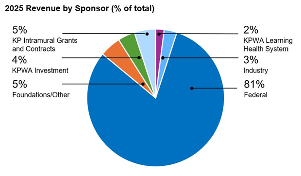 In 2025, KPWHRI’s operating budget was $55.6 million. Federal grant and contract revenue totaled $45.0 million, other sponsored revenue was $4.6 million, and Kaiser Permanente Intramural grants and contracts revenue was $3.7 million. Our number of active grants stood at 263.